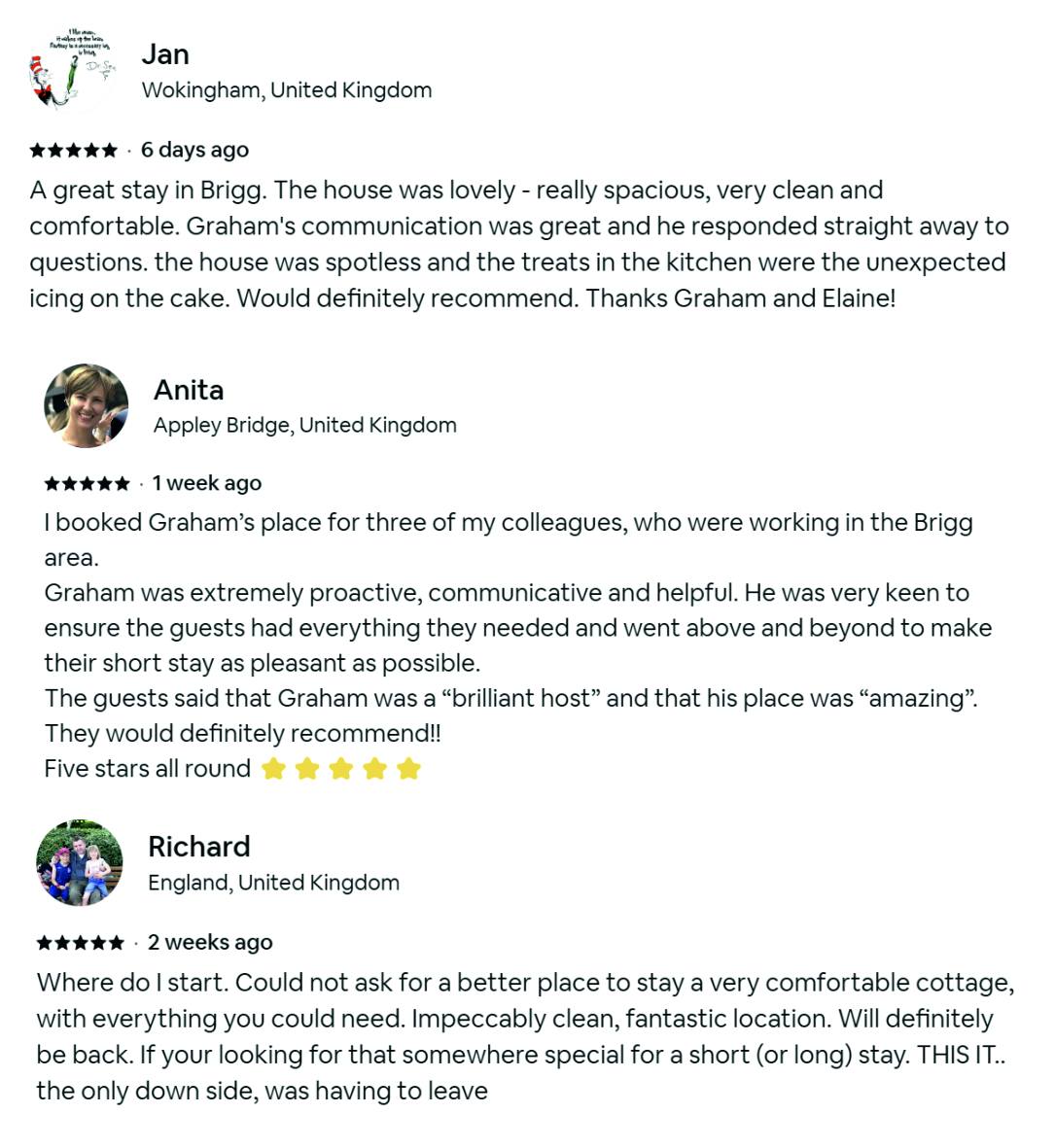 I booked Graham’s place for three of my colleagues, who were working in the Brigg area.Graham was extremely proactive, communicative and helpful. He was very keen to ensure the guests had everything they needed and went above and beyond to make their short stay as pleasant as possible.